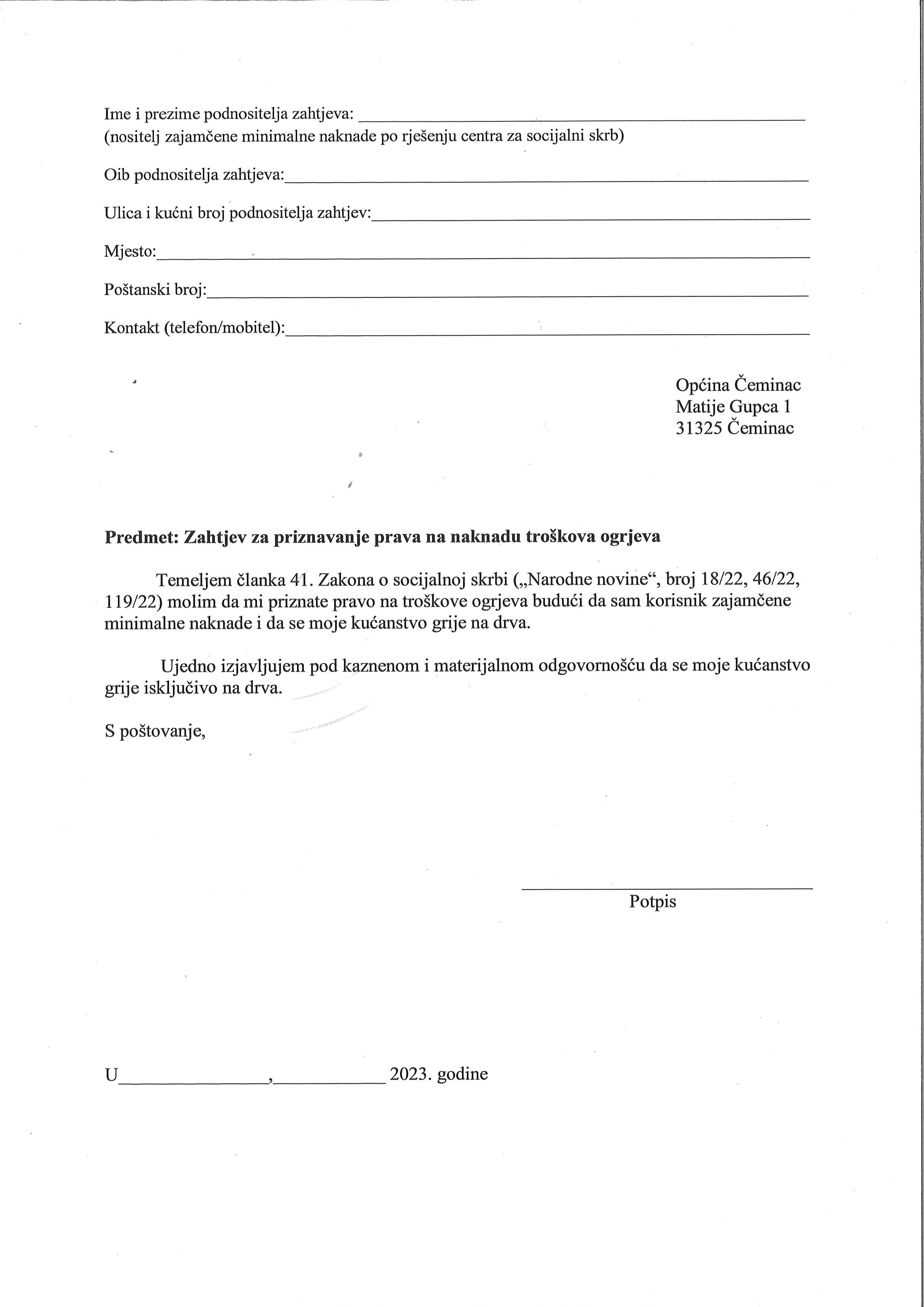 Traženu dokumentaciju sa popunjenim zahtjevom za priznavanje prava na naknadu za troškove stanovanja - ogrjeva potrebno je dostaviti u Općinu Čeminac najkasnije do 2. studenog 2023. godine.
