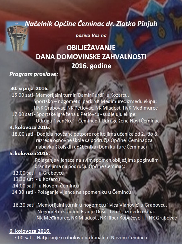 Načelnik Općine Čeminac, dr. Zlatko Pinjuh poziva Vas na obilježavanje Dana domovinske zahvalnosti 2016. godine.