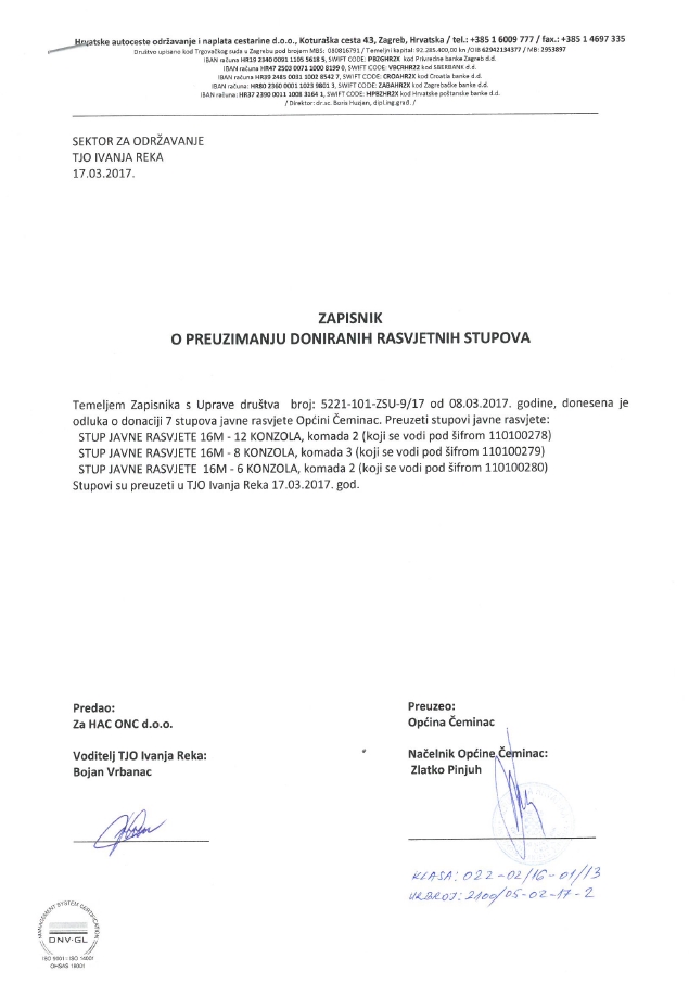 U ime Općine Čeminac i svih njenih mještana, od sveg se srca zahvaljujem Hrvatskim autocestama d.o.o. na ovoj izuzetno vrijednoj donaciji.