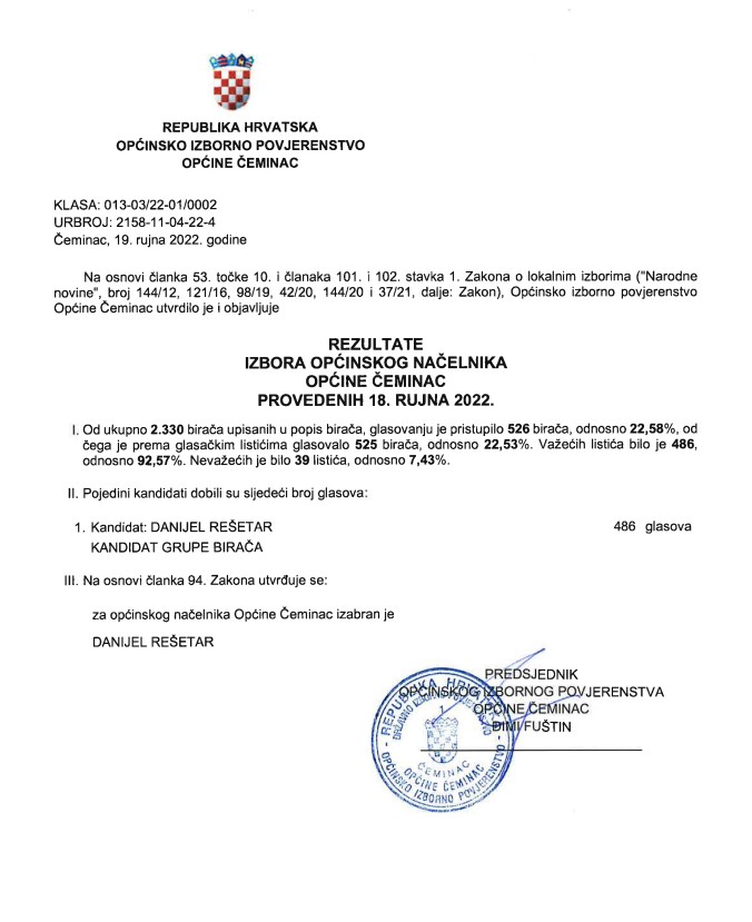 Na osnovi članka 53. točke 10. i članaka 101. i 102. stavka 1. Zakona o lokalnim izborima ("Narodne novine", broj 144/12, 121/16, 98/19, 42/20, 144/20 i 37/21, dalje: Zakon), Općinsko izborno povjerenstvo Općine Čeminac utvrdilo je i objavljuje
