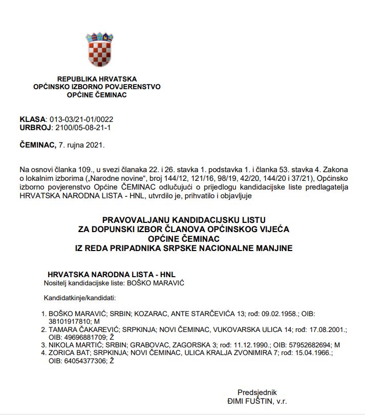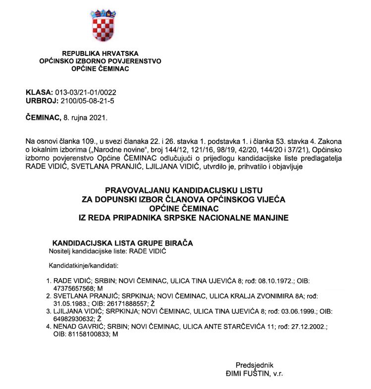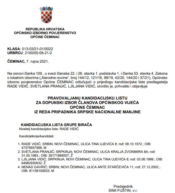 za dopunske izbore Općinskog vijeća Općine Čeminac iz reda pripadnika srpske nacionalne manjine, povlače se.