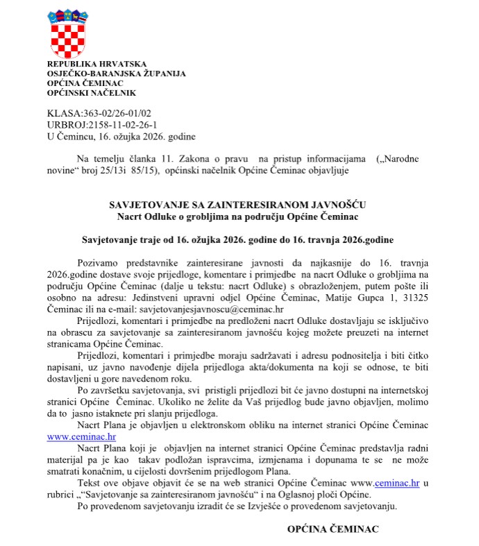 Tekst ove objave objavit će se na web stranici Općine Čeminac www.ceminac.hr u rubrici „“Savjetovanje sa zainteresiranom javnošću“ i na Oglasnoj ploči Općine.