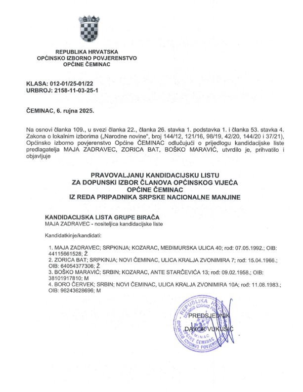 Konačni rezultati dopunskog izbora članova Općinskog vijeća Općine Čeminac iz reda pripadnika srpske nacionalne manjine provedenog 5. listopada 2025.