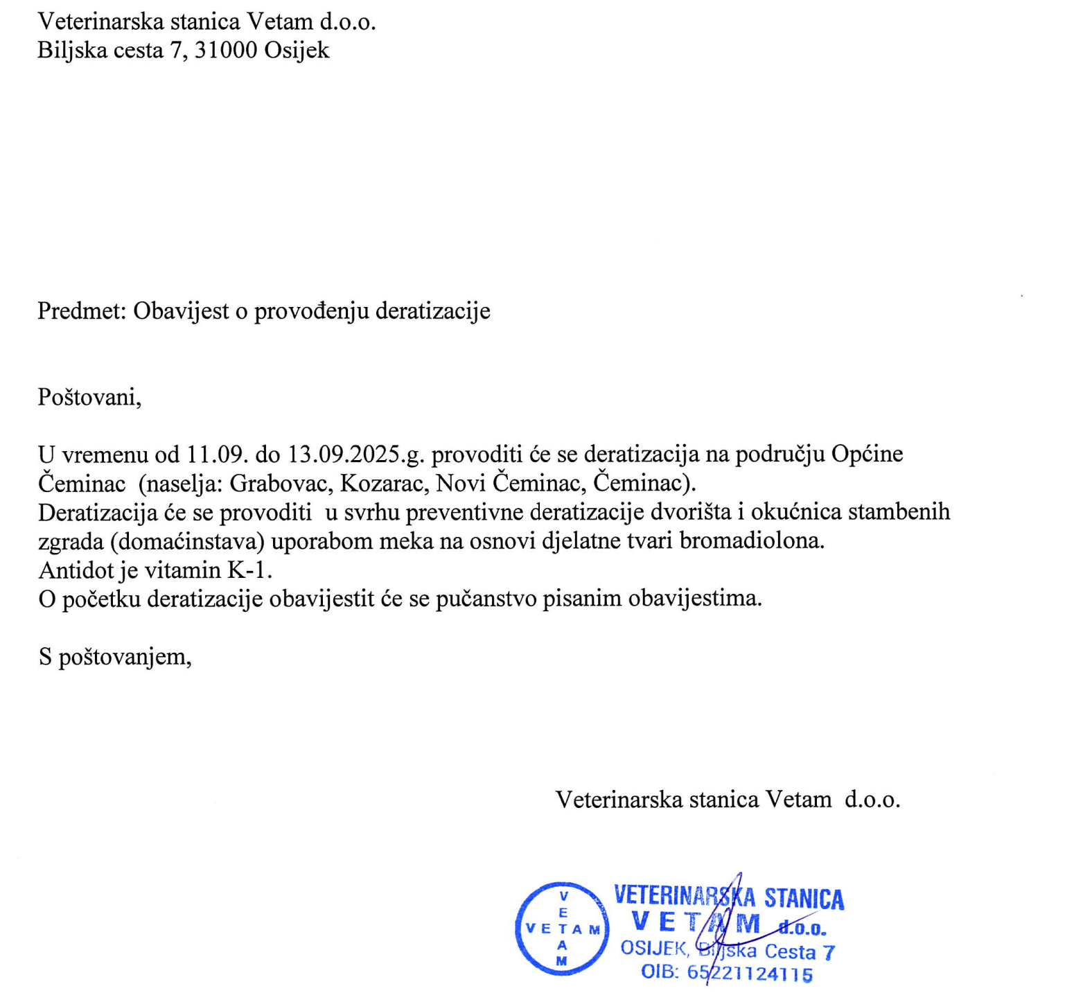 Općina Čeminac obavještava da se Sjednica stožera civilne zaštite i Edukacija u svrhu sprječavanja širenja afričke svinjske kuge, najavljena za petak, 26. rujna 2025. godine, neće održati.