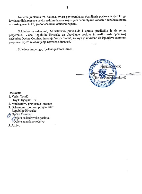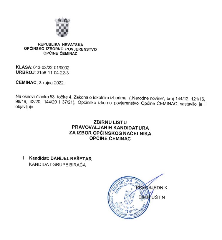 Molimo sve izborne sudionike na području Općine Čeminac da Općinskom izbornom povjerenstvu