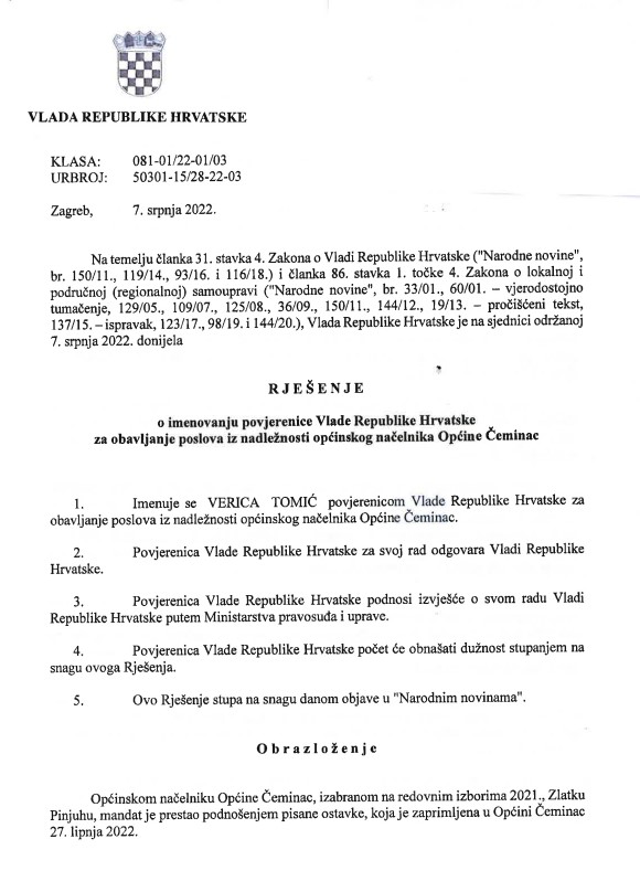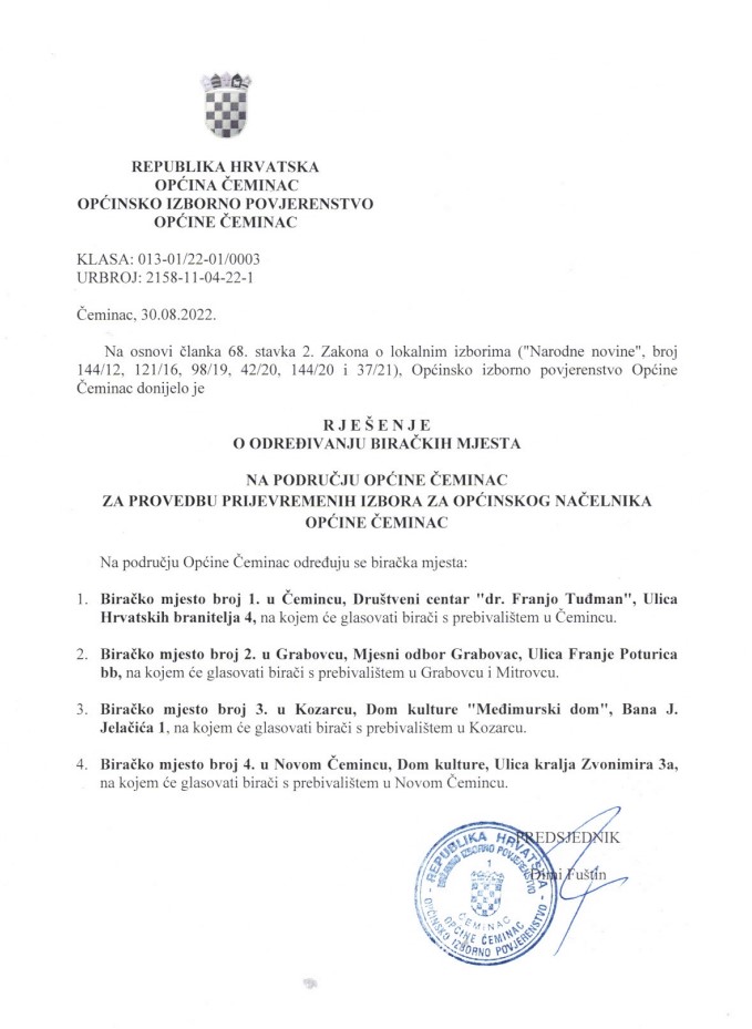 Dana 18.kolovoza 2022. godine stupila je na snagu Vladina odluka o raspisivanju prijevremenih izbora za općinskog načelnika Općine Čeminac koji će se održati u nedjelju 18.rujna 2022. godine.Vezano uz redoslijed izbornih radnji i tijek rokova, odnosno organizaciju dežurstava radi zaprimanja prijedloga kandidata, Općinsko izborno povjerenstvo Općine Čeminac, ovim putem želi obavijestiti sve izborne sudionike na području Općine Čeminac da će dežurstvo biti organizirano u prostorijama Općine Čeminac, Hrvatskih branitelja 4 ,