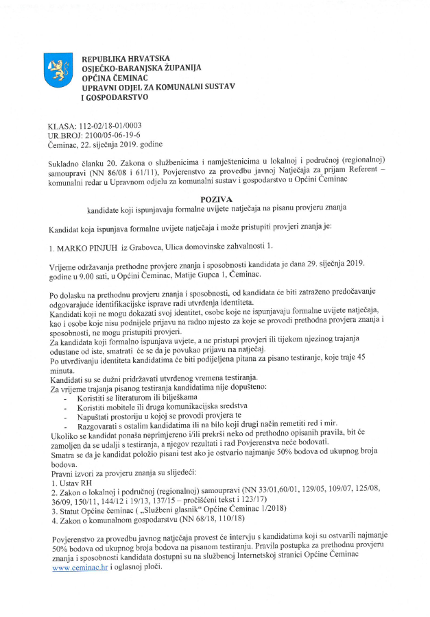 Temeljem članka 42 i 43. Odluke o izborima članova vijeća mjesnih odbora na području Općine Čeminac (Službeni glasnik Općine Čeminac br. 11/18), nakon provedenih izbora 20. siječnja 2019. godine, Općinsko izborno povjerenstvo objavljuje
